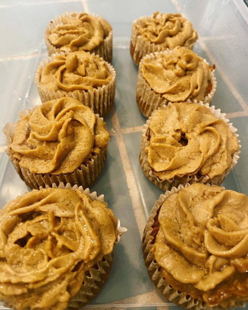 These are peanut butter cupcakes with a whipped peanut butter frosting, packed in white paper liners and stored in a clear plastic container — exactly the kind of thing that looks Pinterest-worthy and makes you feel like the best dog mom alive.